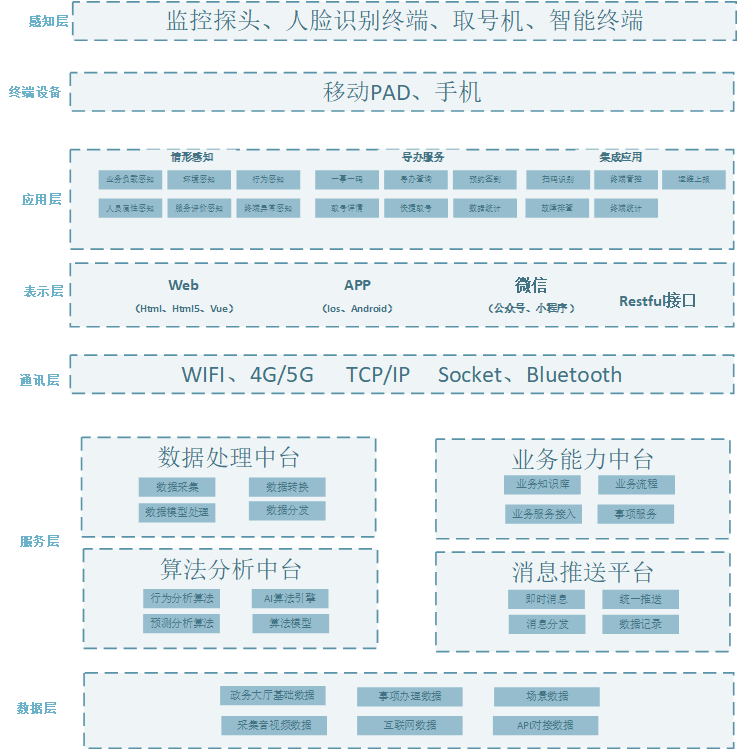 情形感知导办助手的核心是一个集成了感知、分析、决策于一体的智能系统,其架构包含据层服务层、AI能力中枢、数据与服务支撑平台。